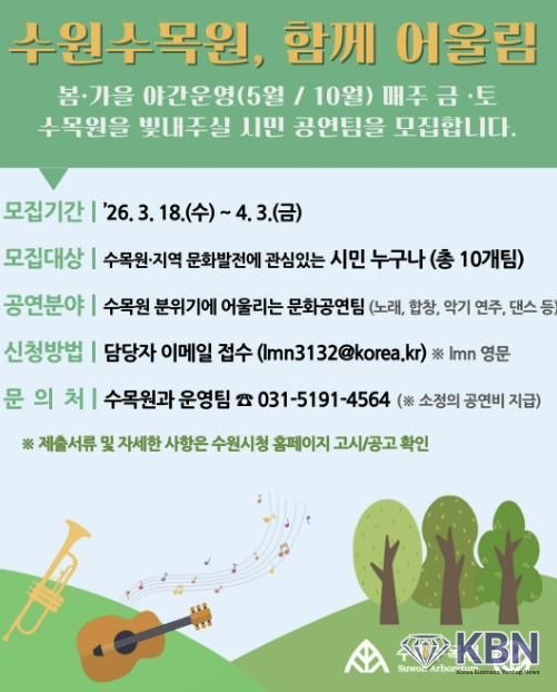 KBN 한국벤처연합뉴스 오경호 기자 | 수원특례시가 수원수목원에서 열리는 시민 참여 문화공연 ‘수원수목원, 함께 어울림’에 참여할 시민 공연팀을 4월 3일까지 모집한다.