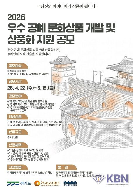 KBN 한국벤처연합뉴스 구일암 기자 | 한국도자재단이 ‘2026 공예 문화상품 개발 및 상품화 지원 사업’을 본격 추진한다고 22일 밝혔다.