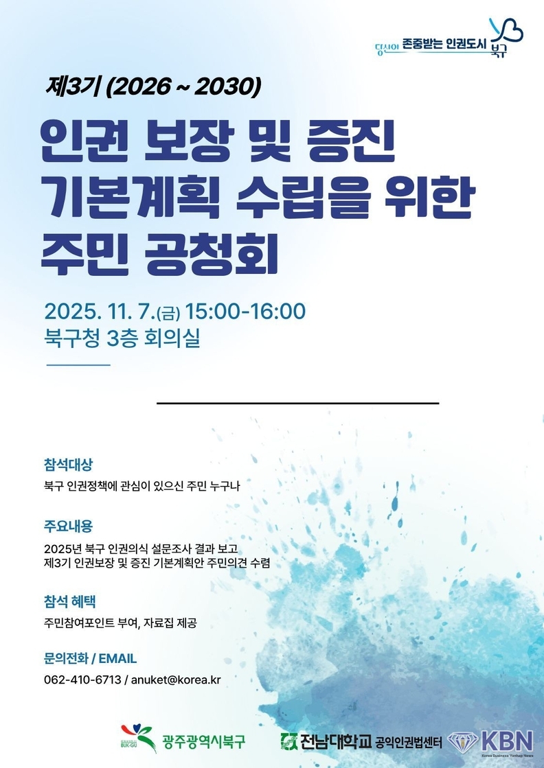 광주광역시 북구(구청장 문인)가 오는 7일 오후 3시, 북구청 3층 회의실에서 ‘제3기 북구 인권보장 및 증진 기본계획’ 수립을 위한 주민공청회를 개최한다고 6일 밝혔다.