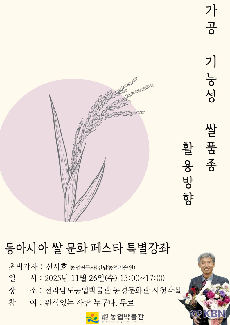 전라남도농업박물관은 26일 오후 3시 ‘동아시아 쌀 문화 페스타’ 다섯 번째 특별강좌를 열어 국내 대표 쌀 품종 개발 전문가를 초청해 미래 쌀 산업의 혁신 모델을 제시한다고 밝혔다.