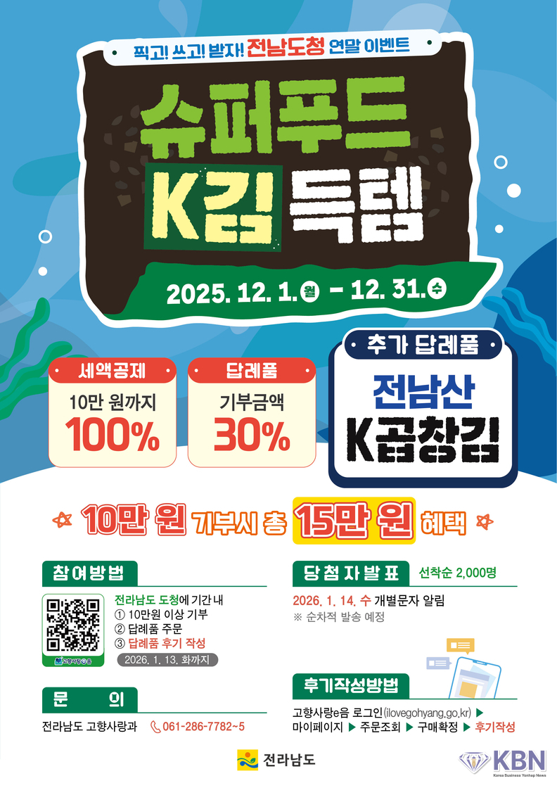 전라남도가 연말을 맞아 고향사랑기부제 참여 확대와 지역 수산물 소비 촉진을 위해 슈퍼푸드 케이(K)김을 활용한 대규모 연말 이벤트를 진행한다.
