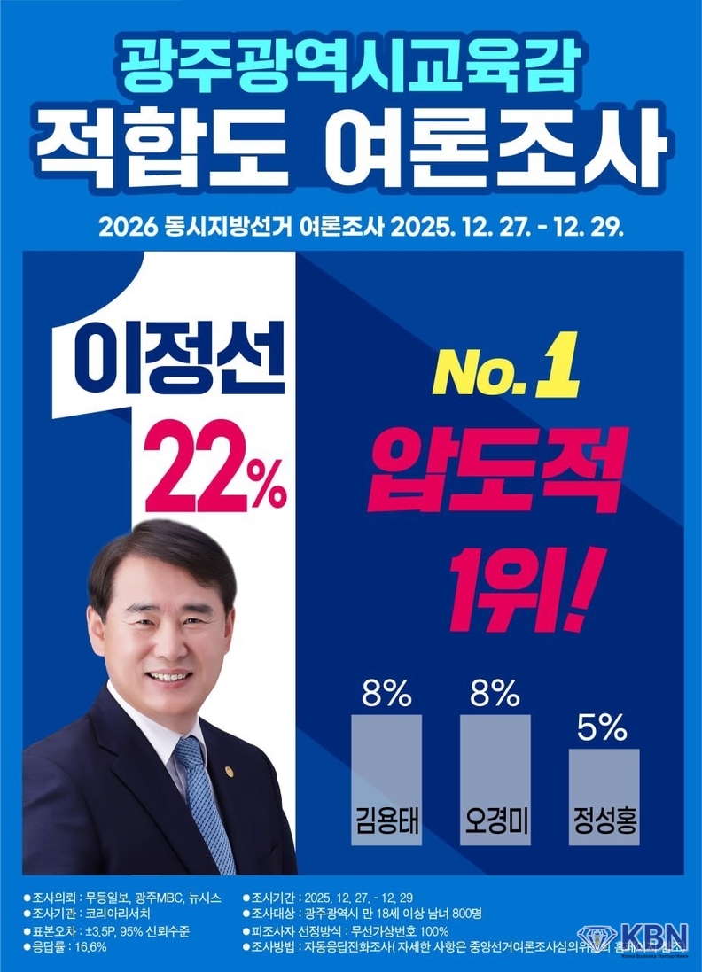 이번 2025.12.27.~29일까지 언론사 공동으로 코리아리서치에서 여론조사를 실시한 결과 차기 광주광역시 교육감 적합도에서 부동의 1위를 차지하였다.