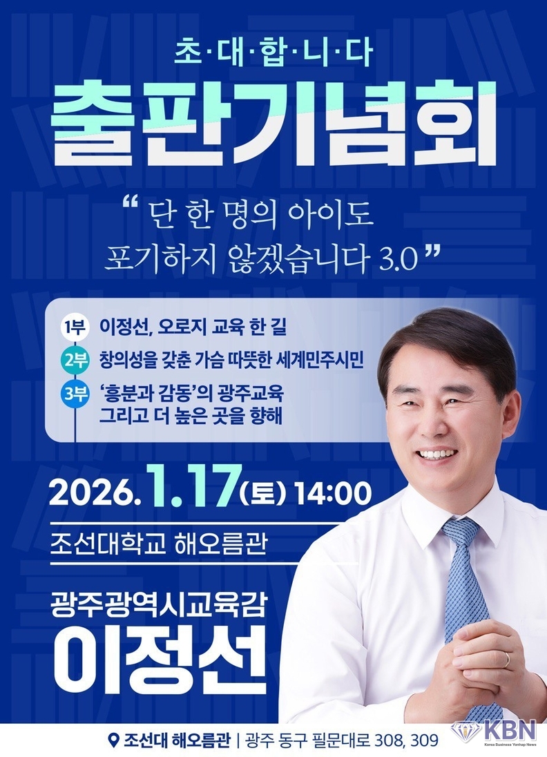 이정선 광주광역시 교육감은 오는 2026.01.17.(토요일) 오후 2시부터 광주광역시 동구 필문대로 308, 309에 위치한 조선대학교 해오름관에서 출판기념회를 개최하여 1, 2, 3부로 나누어 출판기념회 행사를 진행한다.