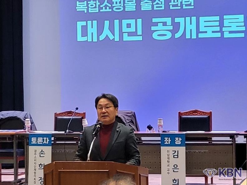 광주광역시 소상공인연합회 이기성 회장은 토론자로서 복합쇼핑몰을 환영한다고 하면서 그러나 소상공인들과 상생을 원칙으로 하자고 하면서 지속할 수 있는 연계와 더불어 상생을 위한 협의체를 구성하자고 제안하였다.