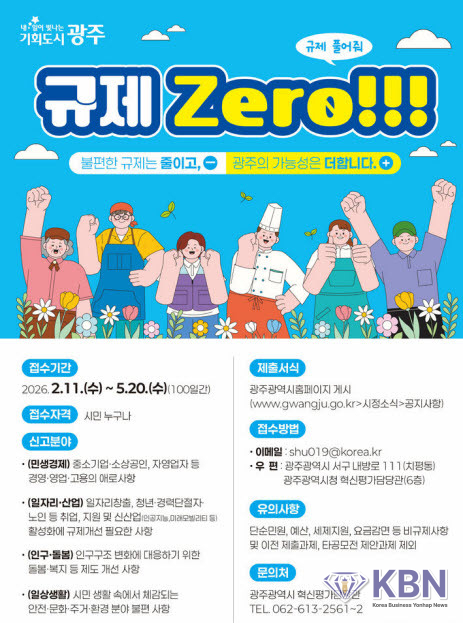 광주시는 '불합리한 규제 집중발굴, 규제 제로'를 목표로 20일까지 100일 동안 불합리한 규제 집중발굴 기간을 운영한다고 11일 밝혔다.