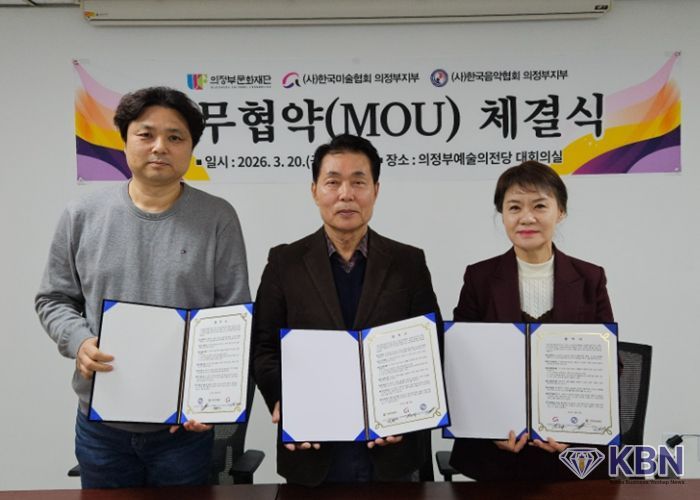KBN 한국벤처연합뉴스 김만일 기자 | (재)의정부문화재단과 (사)한국미술협회 의정부지부, (사)한국음악협회 의정부지부는 2026년 지역 문화예술 발전과 상호 협력 강화를 위한 3자 간 업무협약(MOU)을 체결했다.