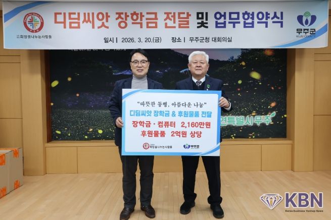 KBN 한국벤처연합뉴스 이경욱 기자 | 무주군은 지난 20일 ‘(사)희망을나누는사람들’과 지역 내 취약계층 아동들의 꿈과 성장을 지원하기 위한 업무협약을 체결하고 ‘디딤씨앗 장학금’ 전달식을 가졌다고 밝혔다.
