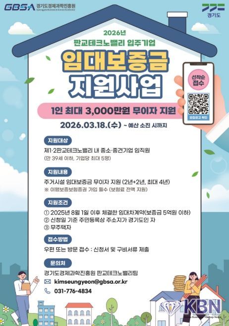 ‘2026년 판교테크노밸리 입주기업 임대보증금 지원사업’은 제1·2판교테크노밸리 입주 중소·중견기업 재직자를 대상으로 최대 3천만 원의 임대보증금을 최장 4년간 무이자로 지원한다.