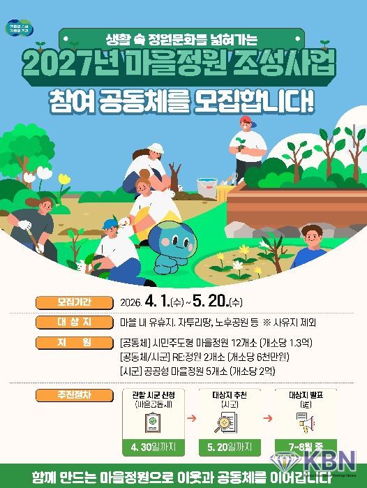 KBN 한국벤처연합뉴스 구일암 기자 | 경기도는 마을 내 방치된 유휴 공간을 주민이 직접 정원으로 가꾸는 ‘2027년 마을정원 조성사업’ 대상지를 5월 20일까지 공개 모집한다.
