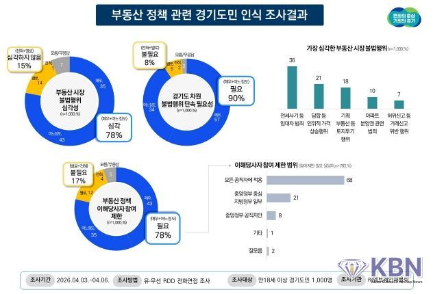 KBN 한국벤처연합뉴스 구일암 기자 | 경기도민의 78%는 현재 부동산 시장의 불법행위를 심각하게 인식하고 있으며 경기도 차원의 단속 강화 필요성에는 90% 도민이 공감한다는 조사결과가 나왔다.