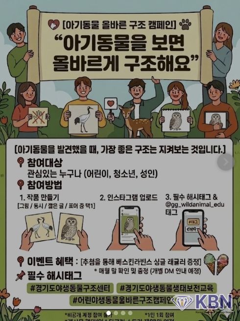 경기도는 어린이를 대상으로 시행하는 ‘야생동물 생태보전교육’에서도 자칫 납치가 될 수 있는 야생동물 구조에 대한 내용을 교육하고 있다. 또 ‘아기동물을 보면 올바르게 구조해요’라는 캠페인을 병행해 미래 세대가 야생동물의 생태적 특성을 이해하고, 인위적 개입을 줄여 자연과 공존하는 삶을 영위할 수 있도록 지속적으로 노력하고 있다.