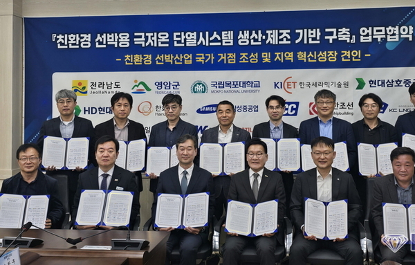 전라남도는 조선해양 분야 최고의 전문성과 기술력을 보유한 대학, 연구기관, 기업들과 친환경 선박용 극저온 단열시스템 생산·제조 기반 구축 업무협약을 지난 6일 목포대학교에서 체결했다. 협약식에는 강위원 전남도 경제부지사, 우승희 영암군수, 송하철 목포대학교 총장, 김진율 제일테크노스 연구소장, 최대규·우명수 KCC 상무, 김흥배 대웅엔지니어링 상무, 김만태 한국세라믹기술원 단장, 조원제 TMC 상무, 심학무 HD현대삼호 전무, 오훈규 HD현대중공업 수석실장, 방창선 삼성중공업 상무, 강중규 한화오션 전무, 이상철 대한조선 본부장 등 핵심 관계자 20여 명이 참석했다. 극저온 단열시스템은 LNG·암모니아 등 친환경 연료를 안정적으로 저장·운용하기 위한 핵심 기술이다. 조선산업이 탄소중립 시대로 전환하고 재생에너지100(RE100)을 실현하는 데 필요한 전략적 기반으로 주목받고 있다. 협약은 친환경 선박의 세계시장을 주도하는 LNG선박 극저온 단열시스템 생산·제조 기반 구축을 위해 산·학·연·관이 협력, 공동 기술 개발과 전문 인력 양성, 정보 교류 등에 공동 대응하기 위한 것이다. 전남도는 지난 2024년 대불산단에 한국형 화물창의 성능평가를 위한 실증기반을