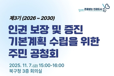공청회에는 북구 인권위원회 위원, 명예 인권 요원, 인권 단체 관계자, 주민 등 100여 명이 참석하며 ▲2025년 북구 인권 의식 설문조사 결과 보고 ▲제3기 인권보장 및 증진 기본계획 연구용역 중간보고 ▲토론 및 자유발언 순으로 진행된다.