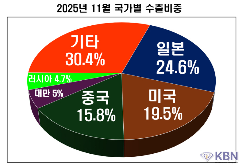 국가별 수출은 일본 1억 9천527만 달러, 미국 1억 5천483만 달러, 중국 1억 2천538만 달러 순이었다. 중국 수출액 가운데 김 비중은 37.0%, 수출액은 4천683만 달러를 기록하며 2024년보다 64.8% 증가했다.