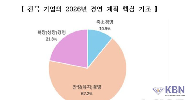 2026년 경영계획의 핵심 기조로는 '안정(유지) 경영'이 67.2%로 가장 높은 비중을 차지했으며, '확장(성장) 경영'은 21.8%, '축소 경영'은 10.9%로 나타나 대다수 기업이 불확실한 경영 환경 속에서 보수적인 경영 전략을 유지할 것으로 전망된다.