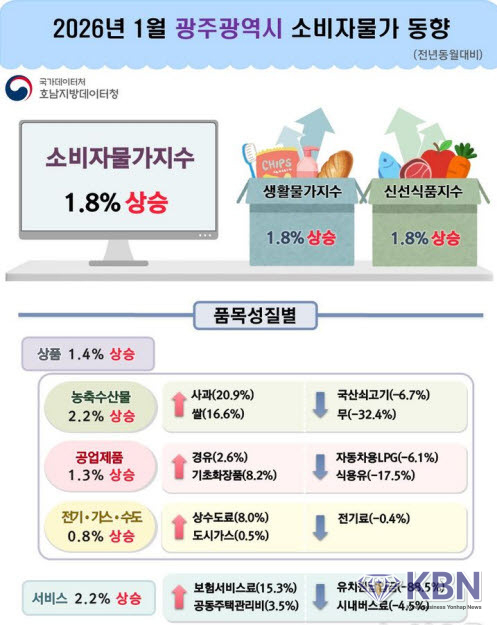 3일 호남지방데이터청의 1월 광주·전남 소비자물가동향에 따르면 지난달 광주 소비자물가는 지난해 같은 달에 비해 1.8%가 상승했다. 전국 평균은 2.0%다.