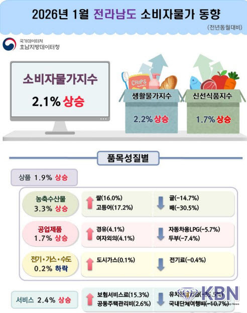 전남 1월 소비자물가지수는 전년동월대비 2.1% 상승했다. 전국 평균보다는 웃돌았다.