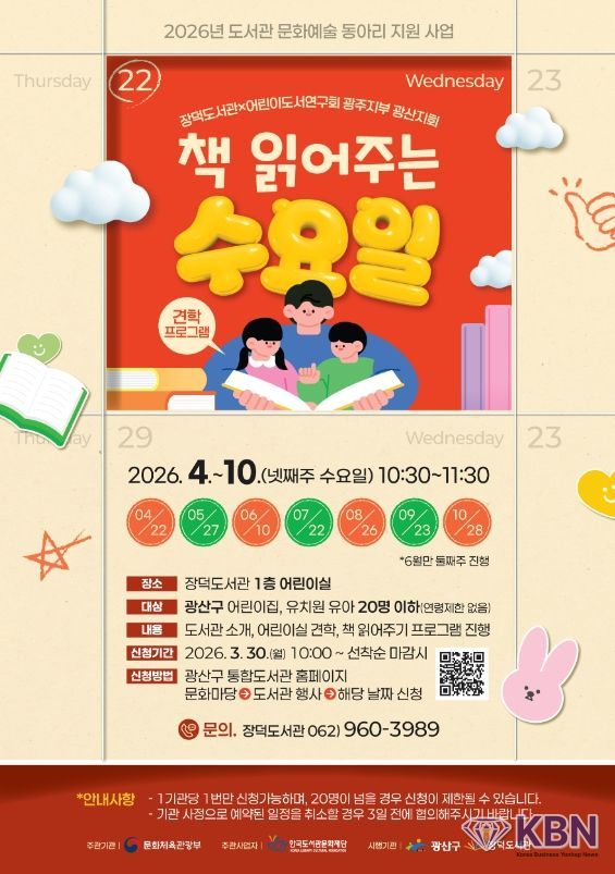 책 읽어주는 수요일은 오는 30일 오전 10시부터 참여기관을 모집하며 광산구 통합도서관 누리집을 통해 선착순으로 진행한다. 일정과 자세한 사항은 누리집 공지사항에서 확인하면 된다.