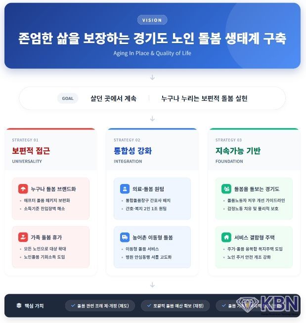 KBN 한국벤처연합뉴스 구일암 기자 | 경기연구원이 빠르게 늘어나는 노인 인구에 대응해 ‘돌봄 생태계’ 구축을 핵심 해법으로 제시했다. 단순히 시설을 늘리는 방식이 아니라, 노인이 살던 집과 지역에서 계속 살아갈 수 있도록 다양한 돌봄 주체가 연결되는 새로운 시스템이다.