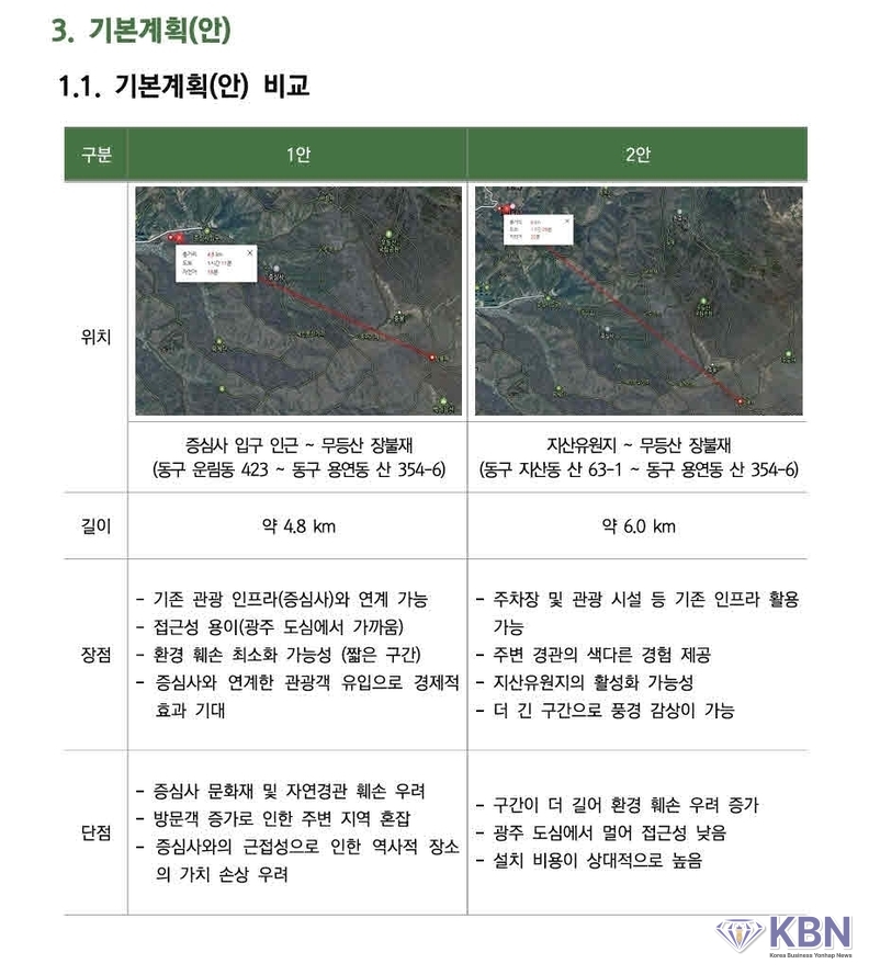 연구원은 증심사 입구∼무등산 장불재까지 4.8㎞ 구간과 지산유원지∼무등산 장불재까지 6㎞를 각각 1, 2안으로 2개 노선을 임의로 정한 뒤 조사용역을 진행했다.