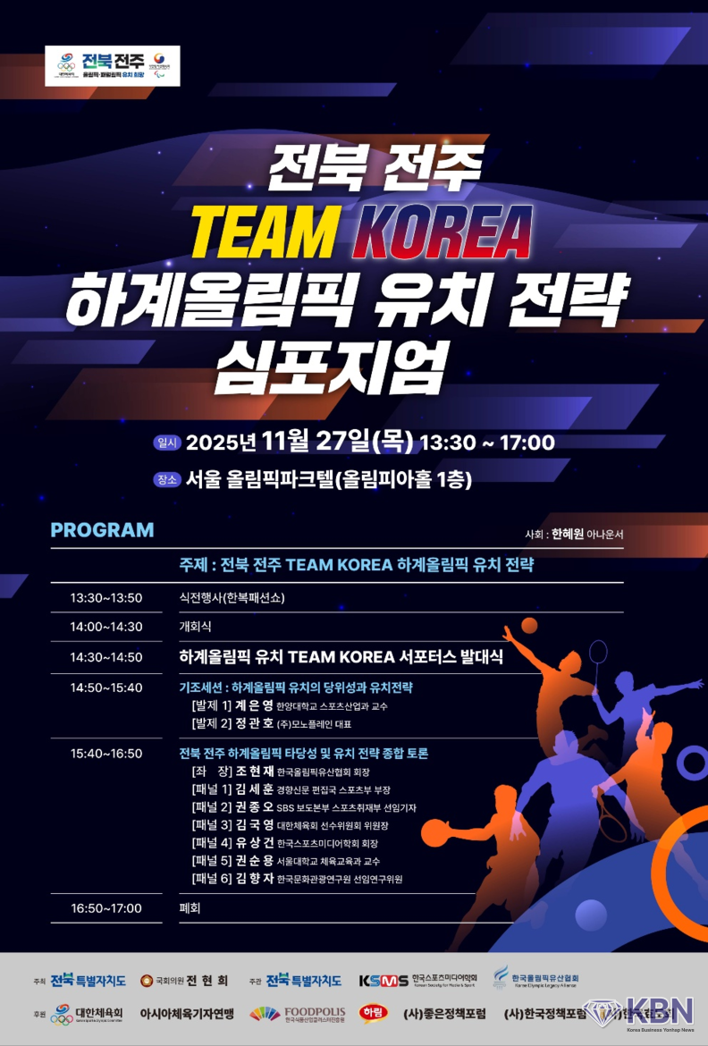 2036 하계올림픽 유치의 당위성을 공유하고, 성공적인 유치전략 마련을 위한 ‘전북전주 Team Korea 올림픽 유치전략 심포지엄’을 11월27일 서울 올림픽파크텔 1층 올림피아홀에서 열린다.