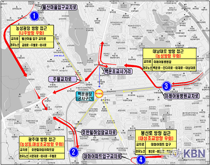 통제 구간 차량 우회도로는 농성교차로에서 백운광장 방향, 월산마을 입구 교차로에서 양궁장 방향, 광주대에서 백운광장 방향, 호반힐하임 교차로에서 양궁장 방향, 남광주(봉선·방림)에서 백운광장 방향, 미래아동병원 교차로에서 기독병원(수피아여고) 방향, 봉선동에서 백운광장 방향, 대화아파트 입구 교차로에서 봉선중앙로(봉선초교) 방향 등이다.