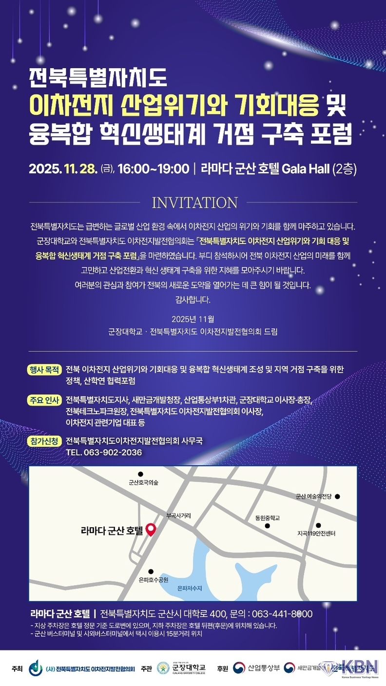 전북 이차전지 산업이 나아갈 방향을 모색하기 위한 ‘전북특별자치도 이차전지 산업위기와 기회대응 및 융복합 혁신생태계 거점 구축포럼’이 군장대학교, (사)전북특별자치도 이차전지발전협의회 공동주최로 지난달 28일 군산 라마다 군산호텔에서 개최됐다.