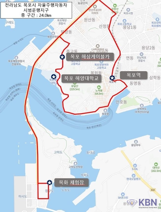 지정 구간은 목포역을 시작으로 해양대학교, 해상케이블카, 목화체험장, 산정농공단지를 거쳐 다시 목포역으로 이어지는 총 24㎞ 순환 노선이다. 유달동·북항동·원산동 등을 포함해 목포 도심과 관광지, 항만 배후 산업권을 폭넓게 연결한다.