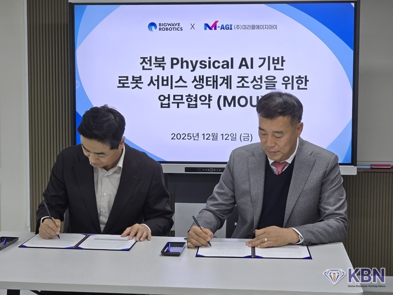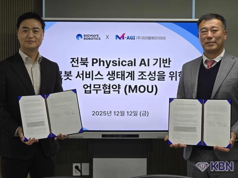 미라클AGI 강현신 대표이사는 RaaS(서비스형 로봇) 전문기업인 빅웨이브로보틱스(대표 김민교)와 2025년 12월 12일, 전북 중심의 피지컬AI 기반 로봇 서비스 확산을 위한 업무협약(MOU)을 체결했다고 밝혔다.