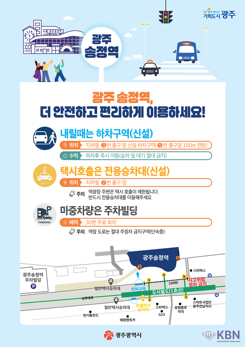 광주시는 도시철도(지하철) 광주송정역 5번 출구 인근에 집중돼 있던 승하차 차량의 혼잡을 개선하기 위해 전방 약 100m 지점인 3번 출구 앞에 ‘하차 전용구역’을 새롭게 조성했다.