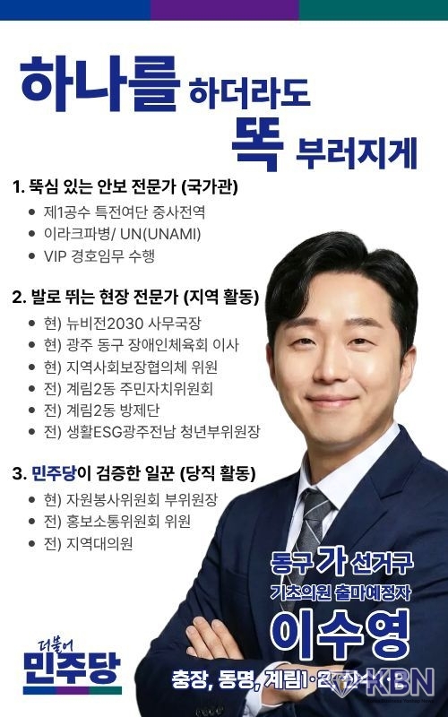 광주 동구 계림동에 거주하고 있는 이수영 광주 동구의회 출마예정자는 광주 동구 발전을 위해 헌신, 봉사를 위해 선거관리 위원회에 광주 동구의회 출마자로 "광주 동구 가 선거구"로 등록할 예정이다.