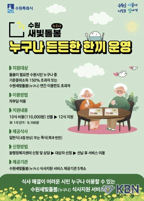 KBN 한국벤처연합뉴스 오경호 기자 | 수원특례시가 자부담으로 수원새빛돌봄(누구나) 식사지원 서비스를 이용하는 시민에게 추가 식사를 제공하는 ‘누구나 든든한 한끼’ 사업을 운영한다.