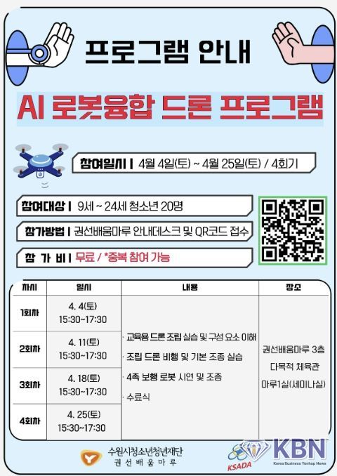 KBN 한국벤처연합뉴스 오경호 기자 | 수원시청소년청년재단 권선배움마루는 오는 4월 청소년을 대상으로 AI 로봇융합 드론 프로그램을 운영할 계획이다. 이번 프로그램은 이론과 실습을 병행한 교육으로 구성되어 미래기술에 대한 이해를 높이고 디지털 역량을 강화하는 데 목적이 있다.