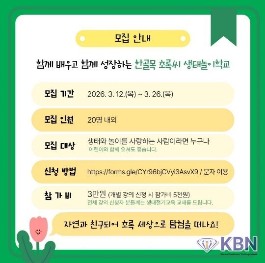 모집기간은 오는 26일까지이며, 생태와 놀이에 관심 있는 누구나 신청 가능하다. 모집인원은 20명 내외로, 참가비는 3만원이며 개별 강의 신청도 가능하다.