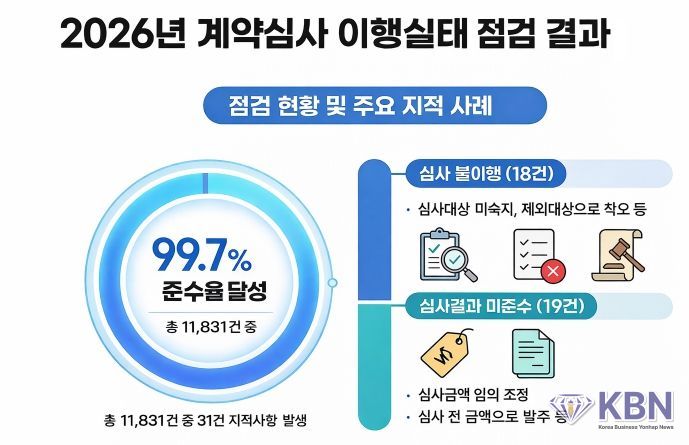 점검 결과 전체 대상 사업의 99.7%가 계약심사 절차를 정상적으로 이행한 것으로 나타났다. 적발된 지적 건수는 총 37건으로 전년 대비 3건 늘었지만 중대한 하자나 과다한 예산 손실 등의 문제는 발견되지 않았다. 지적 사항은 대부분 업무 미숙지 및 부주의에 의한 것으로 분석됐다.