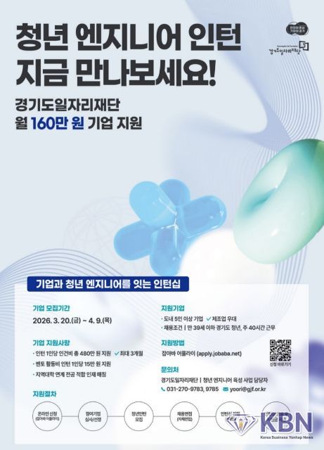 KBN 한국벤처연합뉴스 구일암 기자 | 경기도일자리재단이 ‘청년 엔지니어 육성사업 : 지역 청년 채용연계형 인턴십’ 참여기업을 4월 9일까지 모집한다. 도내 기업과 청년을 연계해 실무 중심 인턴십을 지원하는 사업이다. 최근 ‘경력직 같은 신입’을 선호하는 채용 흐름에 대응해 현장 중심 인재 양성과 기업의 채용 수요 연계를 위해 추진한다.