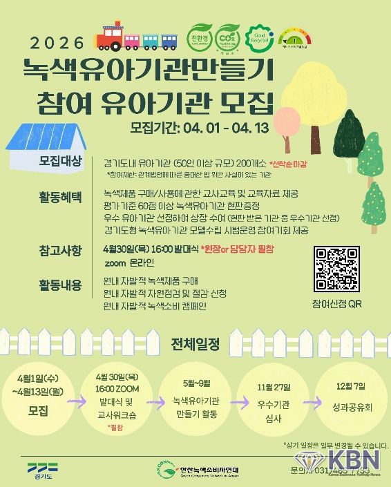 KBN 한국벤처연합뉴스 구일암 기자 | 경기도가 아이들이 생활 속에서 올바른 녹색 소비 습관을 가질 수 있도록 돕는 ‘2026년 녹색유아기관만들기’ 참여 기관 200곳을 4월 13일까지 모집한다.