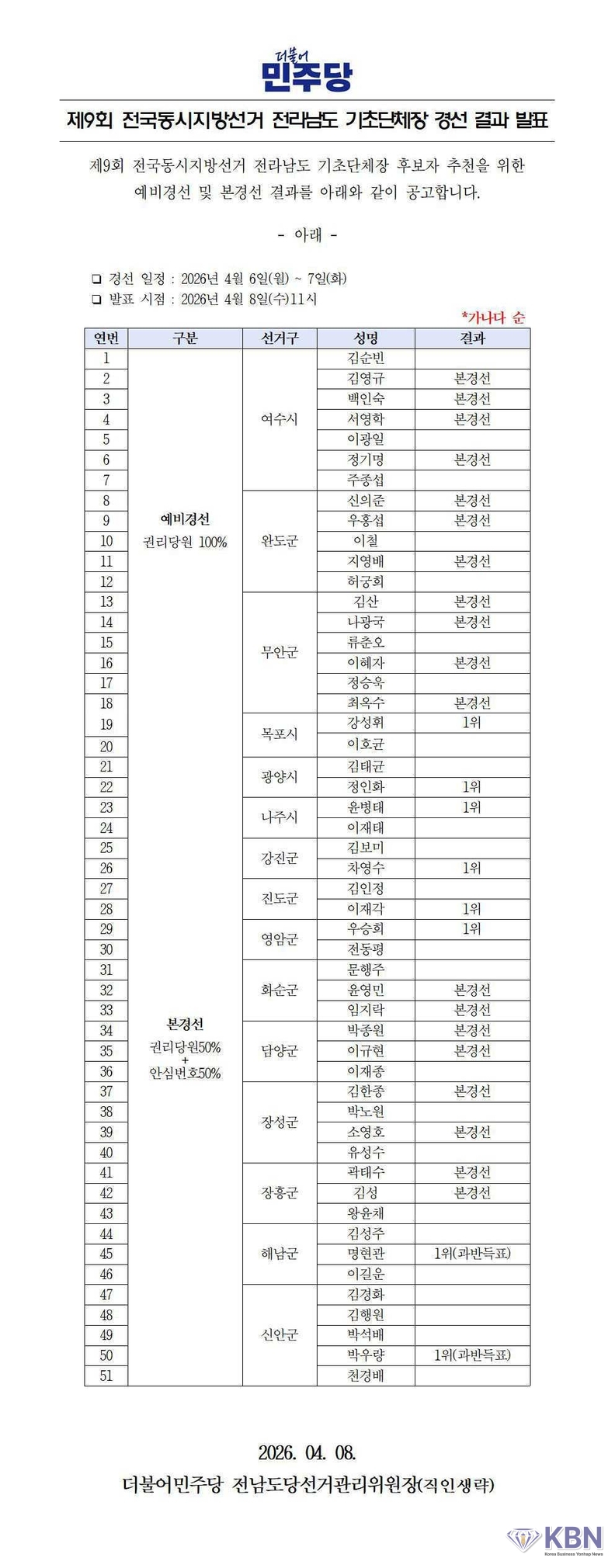 더불어민주당 전남도당이 8일 오전 전남지자체장 경선 결과를 발표했다.