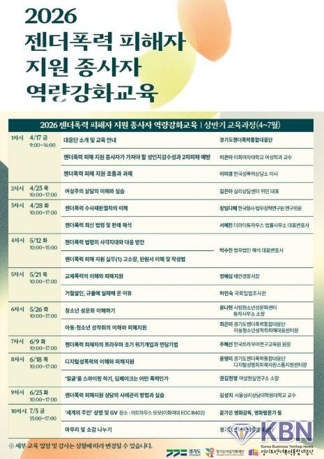 KBN 한국벤처연합뉴스 구일암 기자 | 경기도와 경기도젠더폭력통합대응단이 17일 도내 젠더폭력 피해 지원 현장 종사자들의 전문성 향상을 위한 ‘2026 역량강화 교육’ 상반기 과정을 시작하며 현장 대응력 강화에 나섰다.