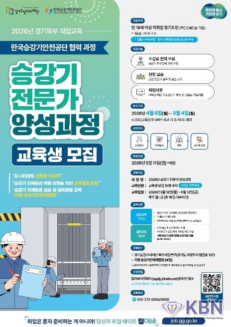 KBN 한국벤처연합뉴스 구일암 기자 | 경기도일자리재단은 승강기 전문 인력 양성을 통해 일자리 문제 해결과 지역경제 활성화를 추진하고자 ‘2026년 승강기 전문가 양성 과정’ 교육생을 모집한다고 21일 밝혔다.
