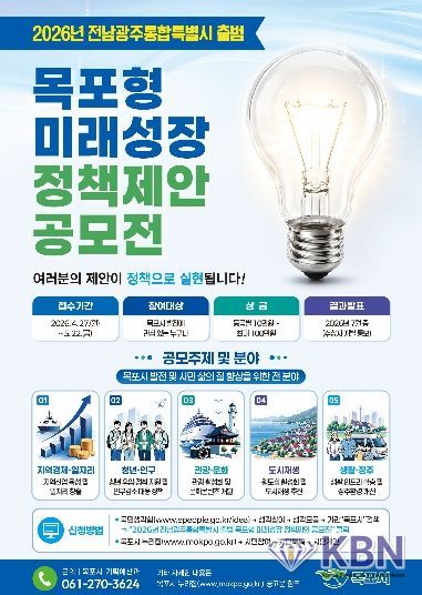 KBN 한국벤처연합뉴스 박종배 기자 | 목포시가 전남·광주 통합특별시 출범에 대비하고 지역의 미래 성장동력을 발굴하기 위해 ‘목포형 미래성장 정책제안 공모전’을 개최한다.