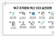 KBN 한국벤처연합뉴스 정광수 기자 | 광주광역시 북구는 건강한 조직으로 체질 개선하기 위한 의지가 담긴 10대 실천강령을 선포한다고 29일 밝혔다. 10대 강령은 일하는 방식 및 경직된 조직문화 개선을 통해 행정서비스의 질적 향상을 도모하고자 마련됐다. 앞서 북구는 지난 2월 수립된 ‘2026년 북구 조직문화 혁신운동 추진계획’을 근거로 부구청장을 단장으로 하는 ‘북구 조직문화 혁신추진단’을 올해 처음 구성했다. 추진단은 ‘조직문화 혁신운동 추진계획’에 포함된 33개의 세부과제가 내실 있게 추진될 수 있도록 점검하고 신규 과제를 발굴하는 역할을 담당한다. 지난 17일에는 추진단의 심의를 통해 조직문화 개선 과정에 공직자들의 참여를 독려하기 위한 ‘10대 실천강령’을 확정했다. 강령은 ▲소통 강화 ▲스마트 행정 ▲유연한 근무 환경 조성 등 3개 중점 과제에 기반해 도출됐으며 올해 초 공직자를 대상으로 실시한 조직문화 진단 설문조사 결과를 반영해 체감도를 높였다. 북구는 다음 달 18일부터 2주간을 ‘10대 강령 집중 실천 기간’으로 정하고 실적 우수부서에는 격려금을 지급하는